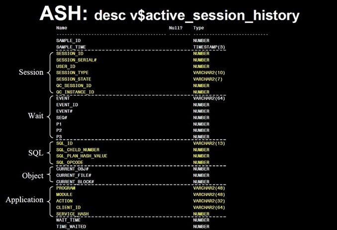Oracle ASH report introduced on Oracle 10GR2. ASH is helpful to identify performance issues in old sessions ASH collects samples of active sessions every second (waiting for non-idle events, or on the CPU working) from v$sessions (inactive sessions are not captured). Sampled data collected to circular buffer in SGA and the same can be accessed through V$ views. V$ACTIVE_SESSION_HISTORY view provides the sampled session activity for the instance. Using the Active Session History you can examine and perform the detailed analysis on the current data in the V$ACTIVE_SESSION_HISTORY and the past data in the DBA_HIST_ACTIVE_SESS_HISTORY view. ASH report is a small report compared to the AWR report which will provide the db/instance details for a short period of time. ASH report covers a much shorter period of time (e.g. 5 min) compared to an AWR report (e.g. 30 min or 1 hour). ASH report captures the following things. SQL identifier of SQL statement Object number, file number, and block number Wait event identifier and parameters Session identifier and session serial number Module and action name Client identifier of the session Service hash identifier Major ASH report sections are: Top User Events Top Background Events Top Cluster Events Top Service/Module Top SQL Command Types Top Phases of Execution Top Remote Instances Top SQL with Top Events ....