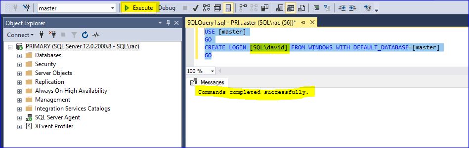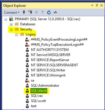 USE [master] GO CREATE LOGIN [SQL\david] FROM WINDOWS WITH DEFAULT_DATABASE=[master] GO![]()