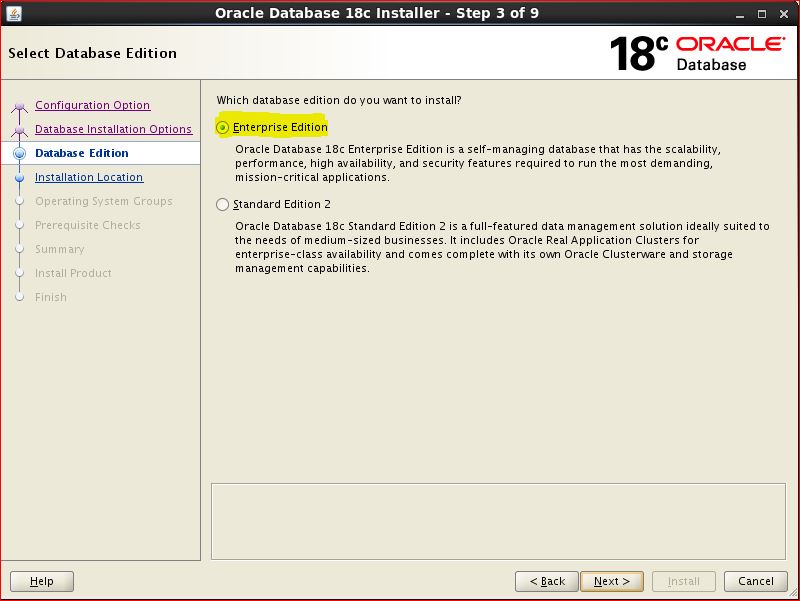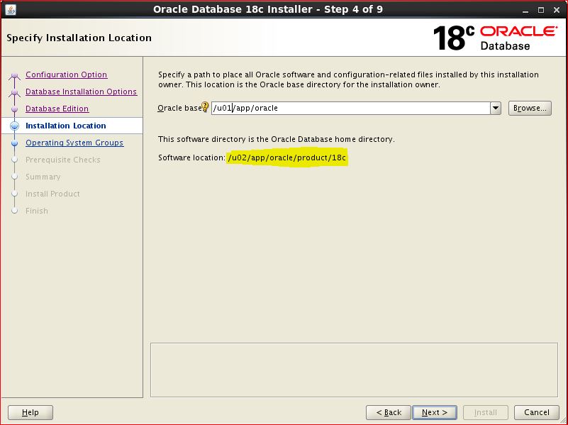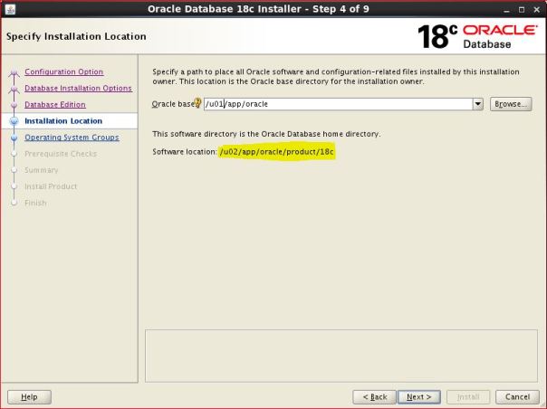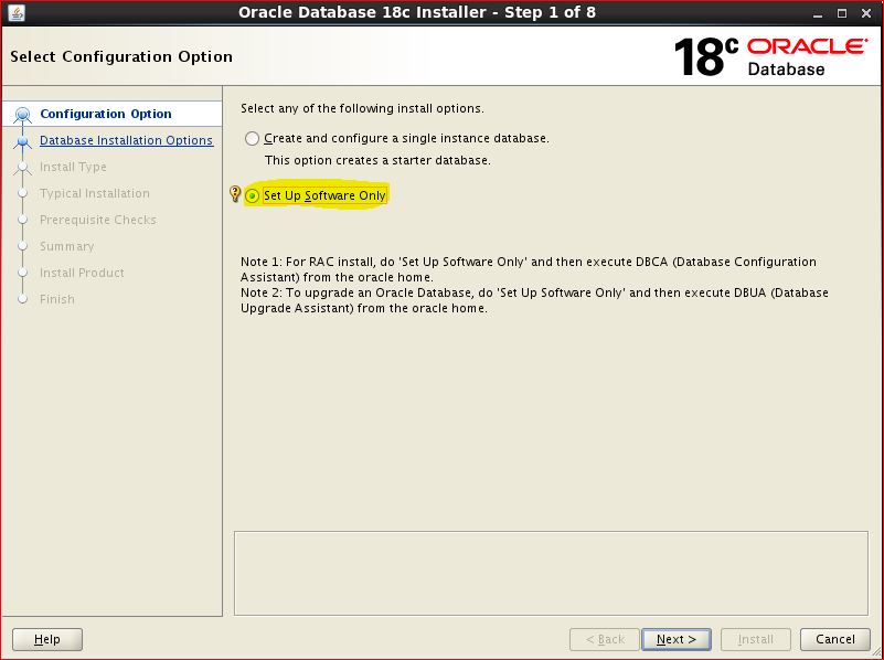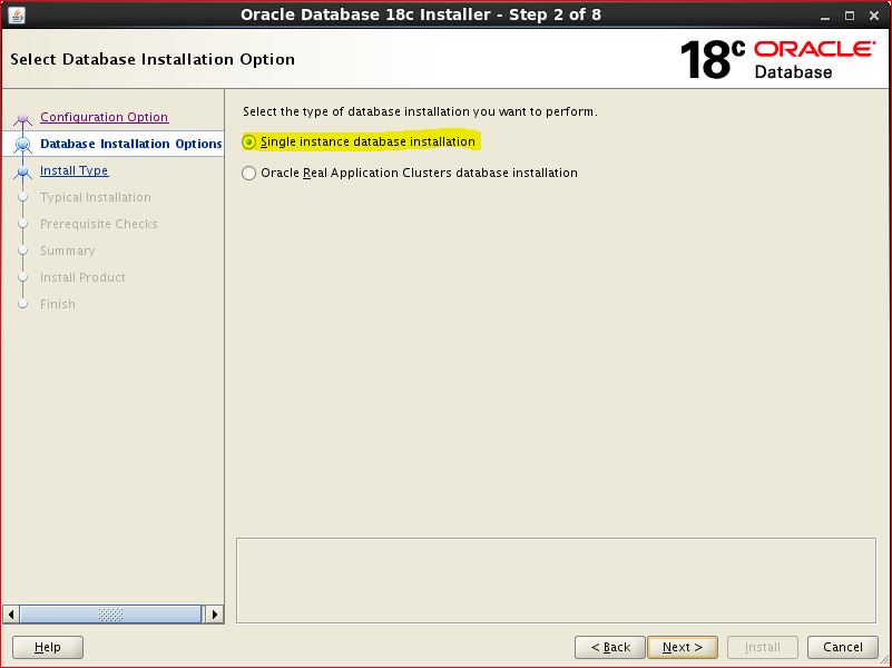 NOTE: You can't edit oracle home location while installation using OUI. It will pickup automatically ORACLE HOME location, where you have unzipped database binaries. Hence directly unzip in ORACLE HOME location and then start ./runInstaller After unzip, it will NOT keep all files in single directory. [oracle@rac1 ]cd /u02/app/oracle/product/18c [oracle@rac1 18c]$ ls -ltr total 4457672 -rw-r--r--. 1 oracle dba Jul 25 20:26 LINUX.X64_180000_db_home.zip [oracle@rac1 18c]$ [oracle@rac1 18c]$ unzip LINUX.X64_180000_db_home.zip [oracle@rac1 18c]$ ls -ltr total 4457972 -rw-r--r--. 1 oracle dba 852 Aug 18 2015 env.ora -rw-r--r--. 1 oracle dba 2927 Oct 14 2016 schagent.conf -rwxr-x---. 1 oracle dba 1783 Mar 8 2017 runInstaller <---- drwxr-x---. 7 oracle dba 4096 Feb 7 23:11 xdk drwxr-xr-x. 3 oracle dba 4096 Feb 7 23:11 wwg drwxr-xr-x. 4 oracle dba 4096 Feb 7 23:11 usm drwxr-xr-x. 5 oracle dba 4096 Feb 7 23:11 suptools drwxr-xr-x. 6 oracle dba 4096 Feb 7 23:11 srvm drwxr-xr-x. 3 oracle dba 4096 Feb 7 23:11 sqlj drwxr-xr-x. 3 oracle dba 4096 Feb 7 23:11 slax -rw-r-----. 1 oracle dba 10 Feb 7 23:11 root.sh.old.1 drwxr-xr-x. 3 oracle dba 4096 Feb 7 23:11 relnotes drwxr-xr-x. 4 oracle dba 4096 Feb 7 23:11 racg drwxr-xr-x. 5 oracle dba 4096 Feb 7 23:11 R drwxr-xr-x. 4 oracle dba 4096 Feb 7 23:11 owm drwxr-xr-x. 3 oracle dba 4096 Feb 7 23:11 oss drwxr-xr-x. 3 oracle dba 4096 Feb 7 23:11 ordim drwxr-xr-x. 4 oracle dba 4096 Feb 7 23:11 oracore drwxr-xr-x. 5 oracle dba 4096 Feb 7 23:11 olap drwxr-xr-x. 4 oracle dba 4096 Feb 7 23:11 mgw drwxr-xr-x. 2 oracle dba 4096 Feb 7 23:11 log drwxr-xr-x. 3 oracle dba 4096 Feb 7 23:11 has drwxr-xr-x. 3 oracle dba 4096 Feb 7 23:11 dv drwxr-xr-x. 3 oracle dba 4096 Feb 7 23:11 diagnostics drwxr-xr-x. 3 oracle dba 4096 Feb 7 23:11 dbjava drwxr-xr-x. 3 oracle dba 4096 Feb 7 23:11 data drwxr-xr-x. 3 oracle dba 4096 Feb 7 23:11 css drwxr-xr-x. 6 oracle dba 4096 Feb 7 23:12 plsql drwxr-xr-x. 2 oracle dba 4096 Feb 7 23:12 dbs drwxr-xr-x. 2 oracle dba 4096 Feb 7 23:12 utl drwxr-xr-x. 2 oracle dba 4096 Feb 7 23:12 instantclient drwxr-xr-x. 13 oracle dba 4096 Feb 7 23:12 dmu drwxr-xr-x. 3 oracle dba 4096 Feb 7 23:12 ucp drwxr-xr-x. 3 oracle dba 4096 Feb 7 23:12 jdbc drwxr-xr-x. 2 oracle dba 4096 Feb 7 23:12 QOpatch drwxr-xr-x. 4 oracle dba 4096 Feb 7 23:12 ords drwxr-xr-x. 5 oracle dba 4096 Feb 7 23:13 sdk drwxr-xr-x. 6 oracle dba 4096 Feb 7 23:13 apex drwxr-xr-x. 22 oracle dba 4096 Feb 7 23:13 sqldeveloper drwxr-xr-x. 8 oracle dba 4096 Feb 7 23:13 odbc drwxr-xr-x. 11 oracle dba 4096 Feb 7 23:14 ctx -rwx------. 1 oracle dba 786 Feb 7 23:14 root.sh.old drwxr-x---. 14 oracle dba 4096 Jun 4 03:20 OPatch drwxr-xr-x. 6 oracle dba 4096 Jul 18 19:17 sqlplus -rwx------. 1 oracle dba 638 Jul 18 19:18 root.sh drwxr-xr-x. 2 oracle dba 4096 Jul 18 19:39 jlib drwxr-xr-x. 5 oracle dba 4096 Jul 18 19:41 sqlpatch drwxr-xr-x. 7 oracle dba 4096 Jul 18 19:44 jdk drwxr-xr-x. 13 oracle dba 4096 Jul 18 19:44 rdbms drwxr-xr-x. 6 oracle dba 4096 Jul 18 19:44 precomp drwxr-xr-x. 5 oracle dba 4096 Jul 18 19:44 perl drwxr-xr-x. 7 oracle dba 4096 Jul 18 19:44 ord drwxr-xr-x. 7 oracle dba 4096 Jul 18 19:44 opmn drwxr-xr-x. 5 oracle dba 4096 Jul 18 19:44 nls drwxr-xr-x. 10 oracle dba 4096 Jul 18 19:44 network drwxr-xr-x. 9 oracle dba 4096 Jul 18 19:44 md drwxr-xr-x. 10 oracle dba 4096 Jul 18 19:44 ldap drwxr-xr-x. 8 oracle dba 4096 Jul 18 19:44 javavm drwxr-xr-x. 5 oracle dba 4096 Jul 18 19:44 hs drwxr-xr-x. 4 oracle dba 4096 Jul 18 19:44 drdaas drwxr-xr-x. 3 oracle dba 4096 Jul 18 19:44 demo drwxr-xr-x. 7 oracle dba 4096 Jul 18 19:44 cv drwxr-xr-x. 6 oracle dba 4096 Jul 18 19:44 crs drwxr-xr-x. 9 oracle dba 4096 Jul 18 19:44 assistants drwxr-xr-x. 8 oracle dba 4096 Jul 18 19:44 oui drwxr-xr-x. 3 oracle dba 16384 Jul 18 19:44 lib drwxr-x---. 13 oracle dba 4096 Jul 18 19:44 inventory drwxr-xr-x. 5 oracle dba 4096 Jul 18 19:44 deinstall drwxr-xr-x. 4 oracle dba 4096 Jul 18 19:44 clone drwxr-xr-x. 2 oracle dba 4096 Jul 18 19:44 bin drwxr-xr-x. 2 oracle dba 4096 Jul 18 19:44 addnode drwxr-xr-x. 10 oracle dba 4096 Jul 18 19:53 install -rw-r--r--. 1 oracle dba Jul 25 20:26 LINUX.X64_180000_db_home.zip [oracle@rac1 18c]$