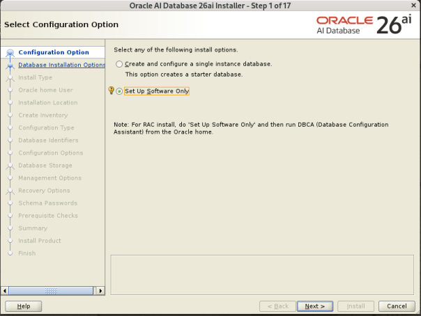 Start the Oracle Universal Installer (OUI) by issuing the following command. [oracle@lxicborasgv01 ~]$ cd /u01/app/oracle/product/23.26.1/dbhome_1/ [oracle@lxicborasgv01 dbhome_1]$ ./runInstaller Launching Oracle AI Database Setup Wizard...![]()