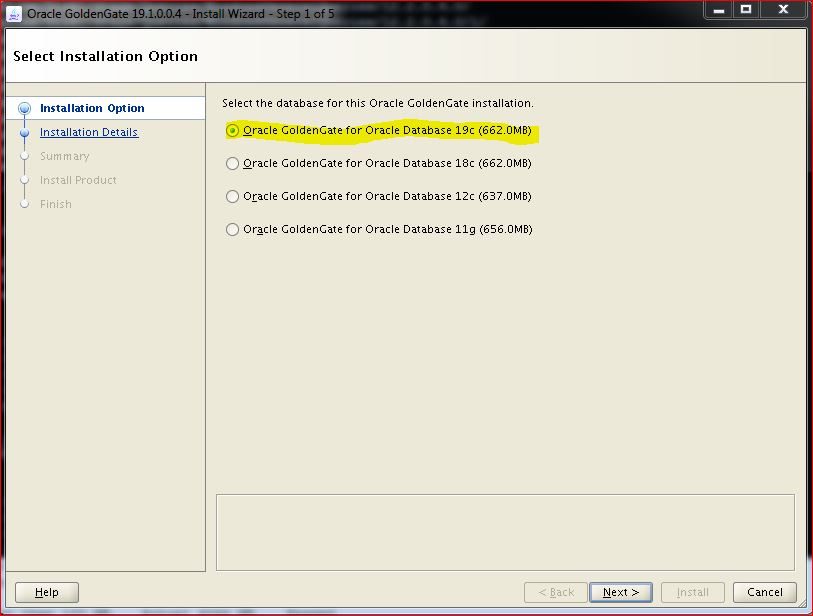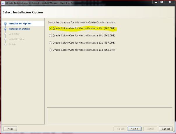 [oracle@rac2 ~]$ mkdir -p /u01/app/oracle/product/19cogg [oracle@rac2 Disk1]$ pwd /u01/app/backup/GG19/fbo_ggs_Linux_x64_shiphome/Disk1 [oracle@rac2 Disk1]$ export DISPLAY=192.168.2.2:0.0 [oracle@rac2 Disk1]$ ls -ltr total 12 drwxr-xr-x 4 oracle oinstall 4096 Oct 18 21:20 install drwxr-xr-x 12 oracle oinstall 4096 Oct 18 21:20 stage -rwxr-xr-x 1 oracle oinstall 918 Oct 18 21:20 runInstaller <----- drwxrwxr-x 2 oracle oinstall 25 Oct 18 21:20 response [oracle@rac2 Disk1]$ [oracle@rac2 Disk1]$ ./runInstaller Starting Oracle Universal Installer... Checking Temp space: must be greater than 120 MB. Actual 4044 MB Passed Checking swap space: must be greater than 150 MB. Actual 4095 MB Passed Checking monitor: must be configured to display at least 256 colors. Actual Passed Preparing to launch Oracle Universal Installer from /tmp/OraInstall2020-02-16_03-29-08AM. Please wait ...![]()