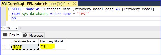 SELECT name AS [Database Name],recovery_model_desc AS [Recovery Model] FROM sys.databases where name = 'TEST'