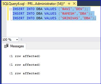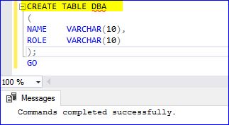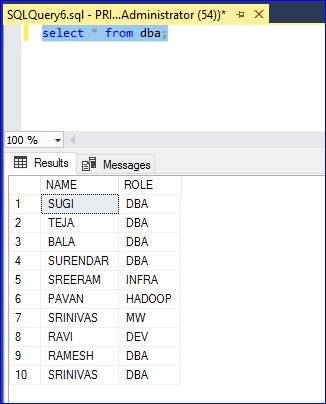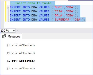 -- create table DBA CREATE TABLE DBA ( NAME VARCHAR(10), ROLE VARCHAR(10) ); GO -- Insert data to table INSERT INTO DBA VALUES ('SUGI','DBA'); INSERT INTO DBA VALUES ('TEJA','DBA'); INSERT INTO DBA VALUES ('BALA','DBA'); INSERT INTO DBA VALUES ('SURENDAR','DBA');![]()