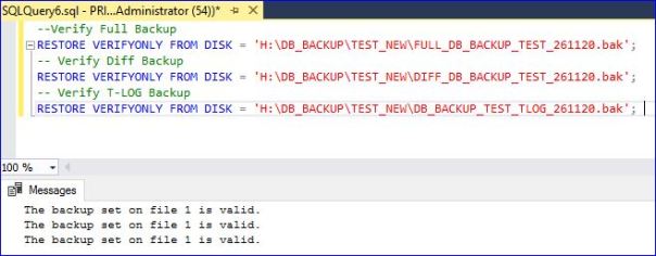 --Verify Full Backup RESTORE VERIFYONLY FROM DISK = 'H:\DB_BACKUP\TEST_NEW\FULL_DB_BACKUP_TEST_261120.bak'; -- Verify Diff Backup RESTORE VERIFYONLY FROM DISK = 'H:\DB_BACKUP\TEST_NEW\DIFF_DB_BACKUP_TEST_261120.bak'; -- Verify T-LOG Backup RESTORE VERIFYONLY FROM DISK = 'H:\DB_BACKUP\TEST_NEW\DB_BACKUP_TEST_TLOG_261120.bak';![]()