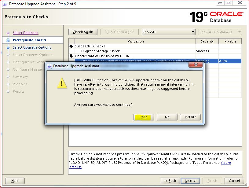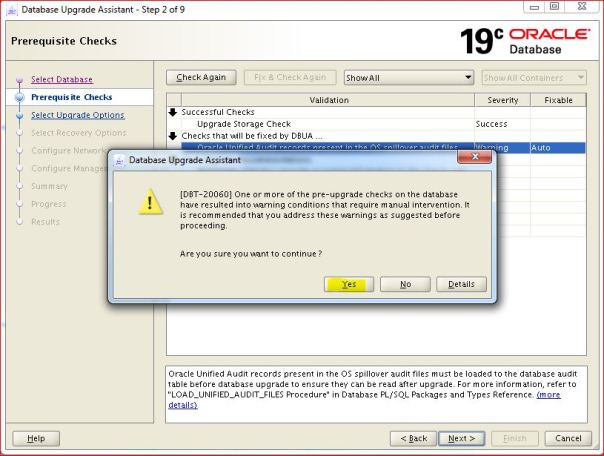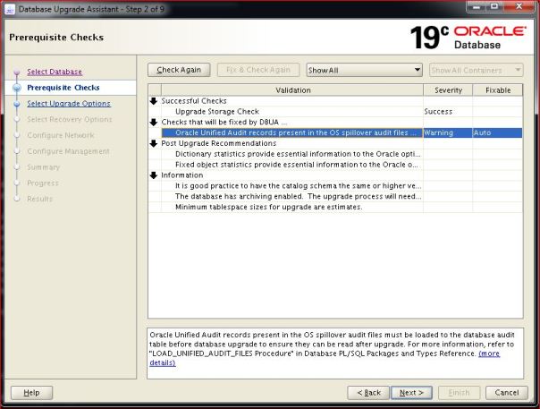 ++ It will run by DBUA, however we are executing manually before start upgrade. SQL> select name,open_mode,db_unique_name,database_role from v$database; NAME OPEN_MODE DB_UNIQUE_NAME DATABASE_ROLE --------- -------------------- ------------------------------ ---------------- HKP READ WRITE HKP_DG LOGICAL STANDBY SQL> SET ECHO ON; SQL> SET SERVEROUTPUT ON; SQL> @/home/oracle/preupgrade/preupgrade_fixups.sql SQL> REM SQL> REM Oracle PRE-Upgrade Fixup Script SQL> REM SQL> REM Auto-Generated by: Oracle Preupgrade Script SQL> REM Version: 19.0.0.0.0 Build: 1 SQL> REM Generated on: 2020-02-09 20:20:41 SQL> REM SQL> REM Source Database: HKP SQL> REM Source Database Version: 12.2.0.1.0 SQL> REM For Upgrade to Version: 19.0.0.0.0 SQL> REM SQL> SQL> REM SQL> REM Setup Environment SQL> REM SQL> SET ECHO OFF SERVEROUTPUT ON FORMAT WRAPPED TAB OFF LINESIZE 200; Executing Oracle PRE-Upgrade Fixup Script Auto-Generated by: Oracle Preupgrade Script Version: 19.0.0.0.0 Build: 1 Generated on: 2020-02-09 20:20:41 For Source Database: HKP Source Database Version: 12.2.0.1.0 For Upgrade to Version: 19.0.0.0.0 Preup Preupgrade Action Issue Is Number Preupgrade Check Name Remedied Further DBA Action ------ ------------------------ ---------- -------------------------------- 1. tablespaces_info NO Informational only. Further action is optional. 2. min_archive_dest_size NO Informational only. Further action is optional. 3. rman_recovery_version NO Informational only. Further action is optional. The fixup scripts have been run and resolved what they can. However, there are still issues originally identified by the preupgrade that have not been remedied and are still present in the database. Depending on the severity of the specific issue, and the nature of the issue itself, that could mean that your database is not ready for upgrade. To resolve the outstanding issues, start by reviewing the preupgrade_fixups.sql and searching it for the name of the failed CHECK NAME or Preupgrade Action Number listed above. There you will find the original corresponding diagnostic message from the preupgrade which explains in more detail what still needs to be done. PL/SQL procedure successfully completed. SQL>