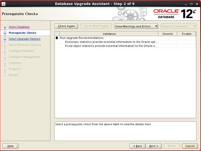 SQL> SET ECHO ON; SQL> SET SERVEROUTPUT ON; SQL> @/home/oracle/preupgrade/preupgrade_fixups.sql SQL> REM SQL> REM Oracle PRE-Upgrade Fixup Script SQL> REM SQL> REM Auto-Generated by: Oracle Preupgrade Script SQL> REM Version: 12.2.0.1.0 Build: 1 SQL> REM Generated on: 2018-09-17 06:27:19 SQL> REM SQL> REM Source Database: COKE SQL> REM Source Database Version: 11.2.0.4.0 SQL> REM For Upgrade to Version: 12.2.0.1.0 SQL> REM SQL> SQL> REM SQL> REM Setup Environment SQL> REM SQL> SET ECHO OFF SERVEROUTPUT ON FORMAT WRAPPED TAB OFF LINESIZE 200; Executing Oracle PRE-Upgrade Fixup Script Auto-Generated by: Oracle Preupgrade Script Version: 12.2.0.1.0 Build: 1 Generated on: 2018-09-17 06:27:19 For Source Database: COKE Source Database Version: 11.2.0.4.0 For Upgrade to Version: 12.2.0.1.0 Fixup Check Name Status Further DBA Action ---------- ------ ------------------ em_present Passed None amd_exists Passed None dictionary_stats Passed None trgowner_no_admndbtrg Passed None apex_upgrade_msg Failed Manual fixup recommended. min_archive_dest_size Failed Manual fixup recommended. PL/SQL procedure successfully completed. SQL>
