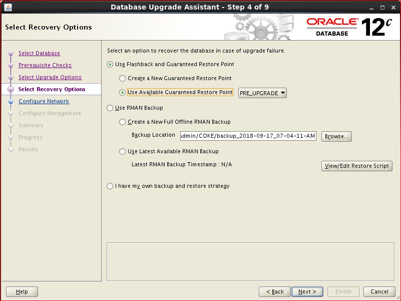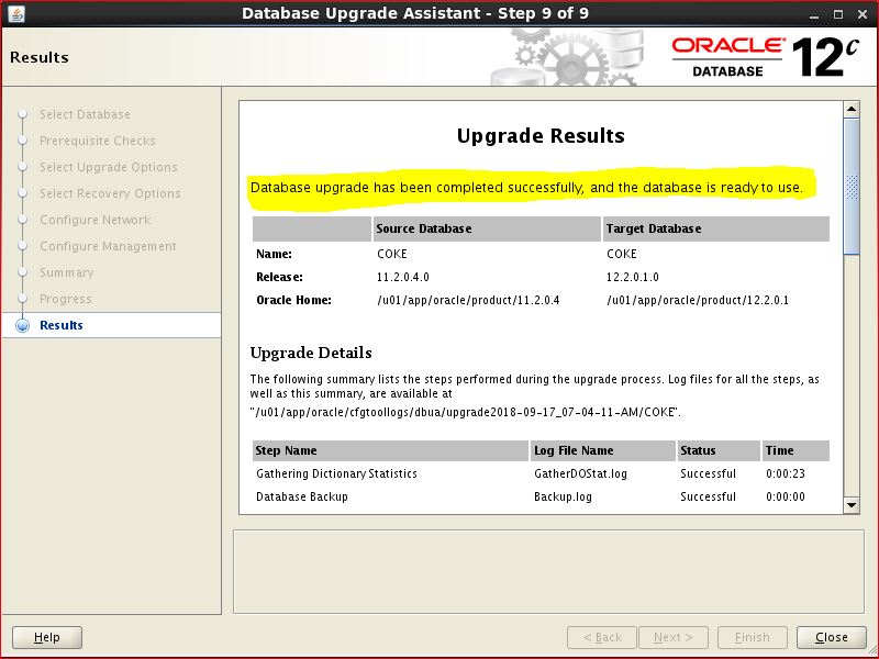 [oracle@rac2 ~]$ /u01/app/oracle/product/12.2.0.1/bin/dbua Logs directory: /u01/app/oracle/cfgtoollogs/dbua/upgrade2018-09-17_07-04-11-AM Preupgrade generated files: /u01/app/oracle/cfgtoollogs/dbua/upgrade2018-09-17_07-04-11-AM/COKE/upgrade.xml /u01/app/oracle/cfgtoollogs/dbua/upgrade2018-09-17_07-04-11-AM/COKE/preupgrade_fixups.sql /u01/app/oracle/cfgtoollogs/dbua/upgrade2018-09-17_07-04-11-AM/COKE/postupgrade_fixups.sql![]()